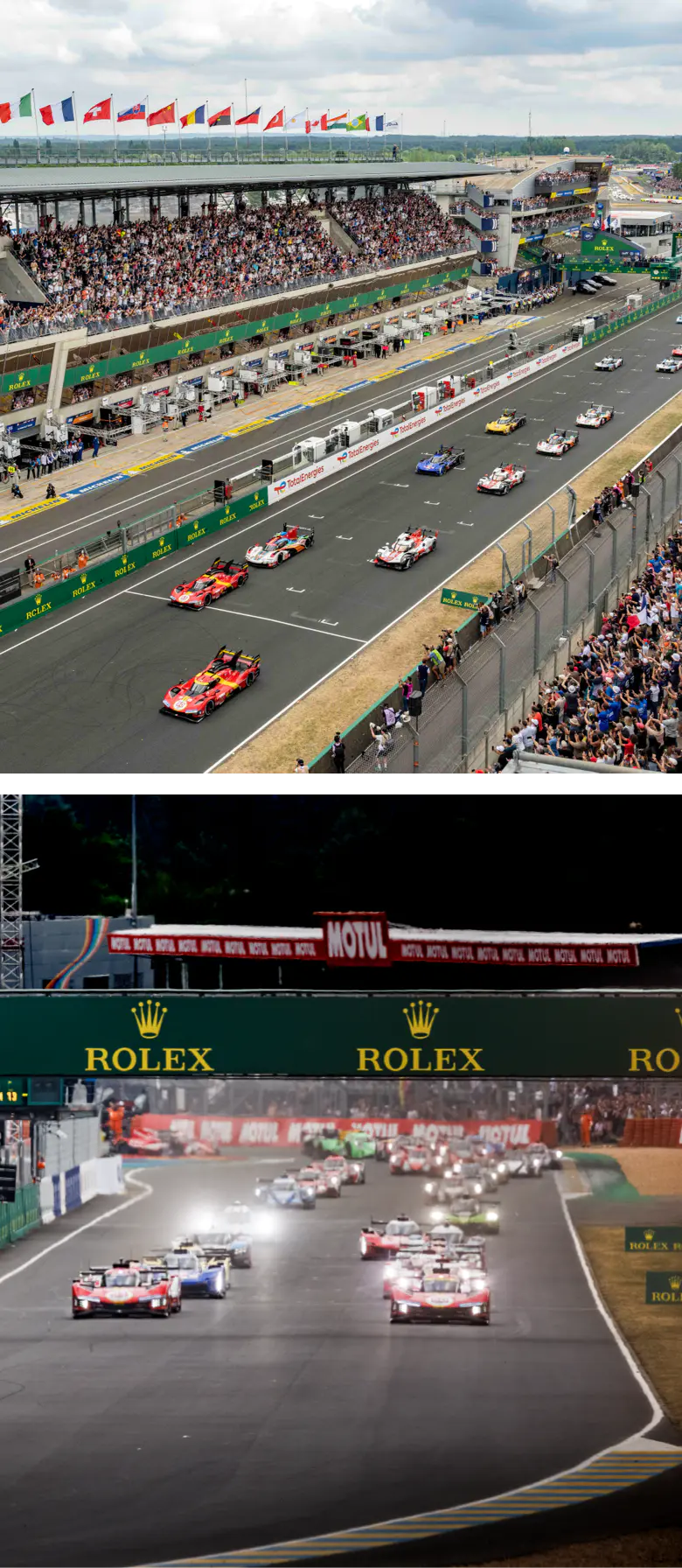 Nata nel 1923, la 24 Ore di Le Mans è una delle gare più antiche e prestigiose del mondo e attira alcuni dei più grandi nomi degli sport automobilistici. A essere messe alla prova sono sia l’affidabilità delle vetture che la resistenza fisica e mentale dei piloti. Sessantadue equipaggi, composti ognuno di tre piloti, si sfidano sui 13,6 chilometri del Circuit de la Sarthe, nel nordovest della Francia, al volante dei bolidi suddivisi in tre categorie di veicoli, Prototipi e Gran Turismo. La vittoria va alla squadra che percorre la distanza maggiore, circa 5.300 chilometri, nell’arco di ventiquattro ore. Rolex è partner dell’evento dal 2001 in qualità di Orologio Ufficiale.