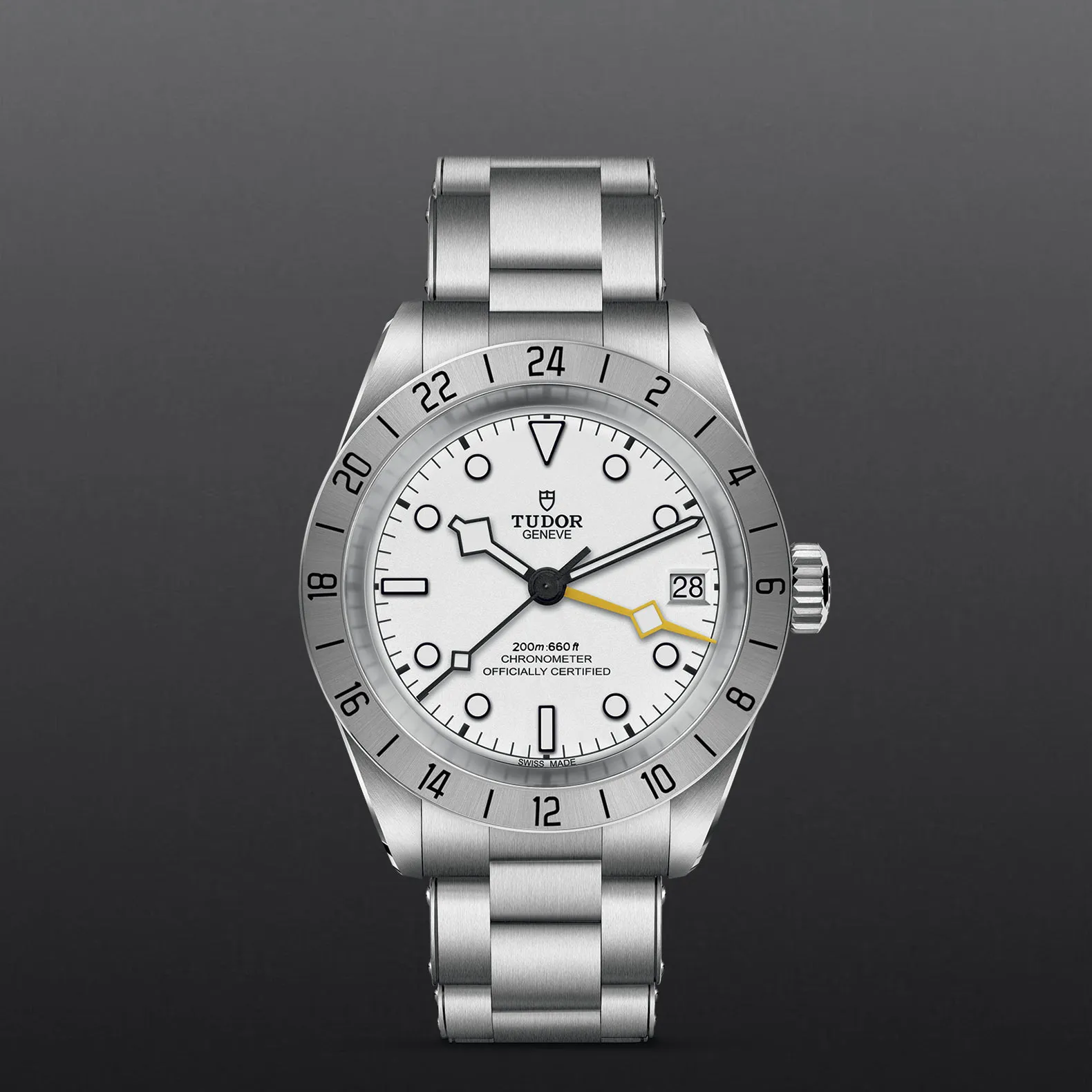 Il Black Bay Pro è un modello interamente nuovo dotato di doppio fuso orario, una complicazione tecnica che permette di visualizzare l’ora locale senza perdere di vista l’ora di un altro fuso orario. Compatto, robusto e sportivo, questo modello presenta numerosi dettagli estetici unici e celebra lo spirito degli orologi tecnici che TUDOR ha prodotto per i professionisti nel corso della sua storia. Riconoscibile grazie alla lunetta fissa satinata graduata 24 ore e alla lancetta “Snowflake” 24 ore di colore giallo, il Black Bay Pro è animato dal Calibro di Manifattura TUDOR MT5652 con funzione GMT integrata.