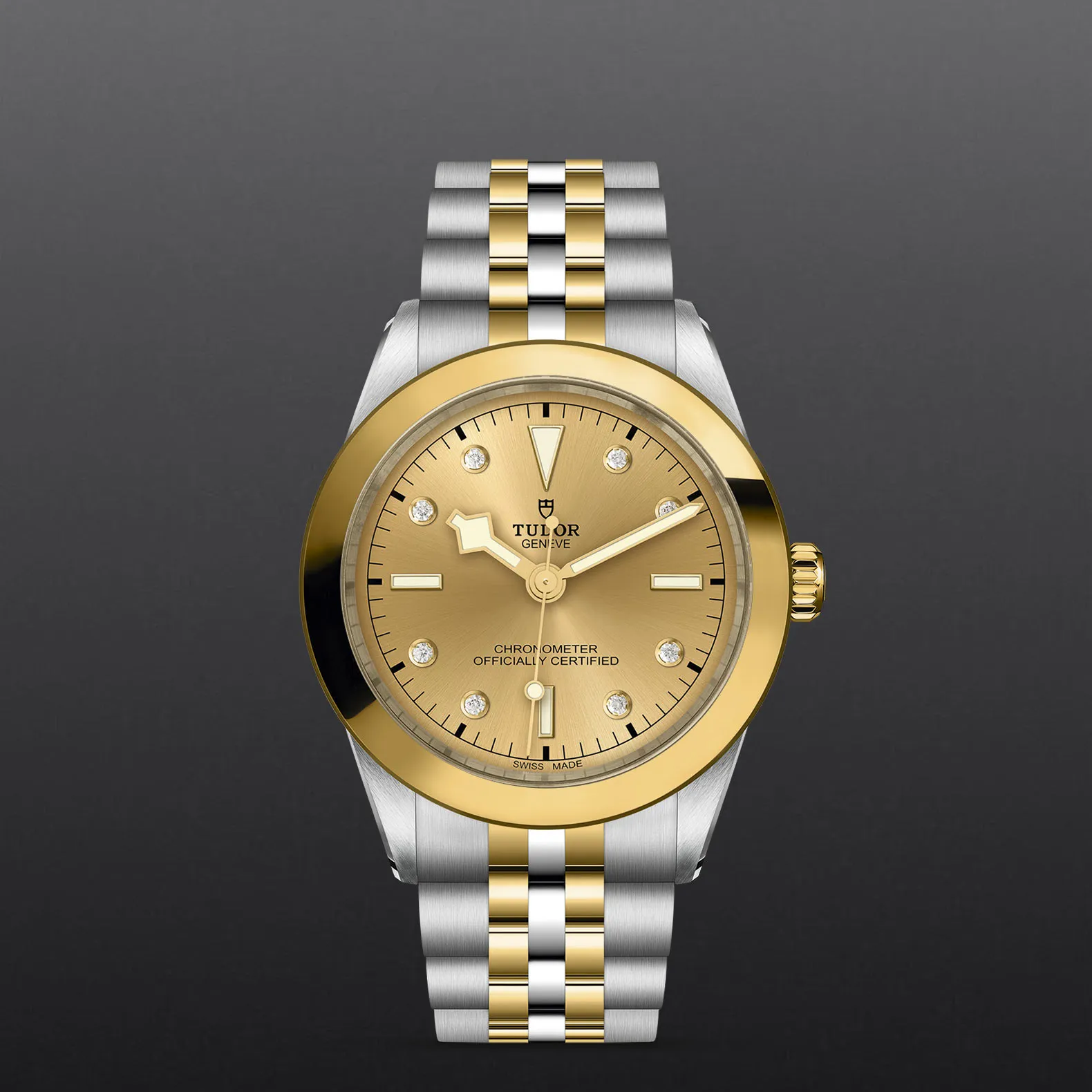 Prime maglie centrali in acciaio o in oro giallo massiccio. Le altre maglie centrali sono costituite da un’anima in acciaio rivestita da 0,2 mm di oro giallo. Chiusura pieghevole TUDOR “T?fit” con fermaglio di sicurezza. Il logo sul fermaglio è realizzato.