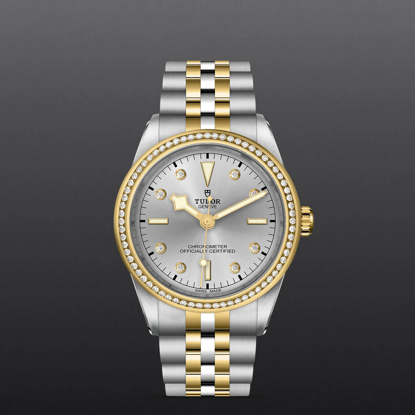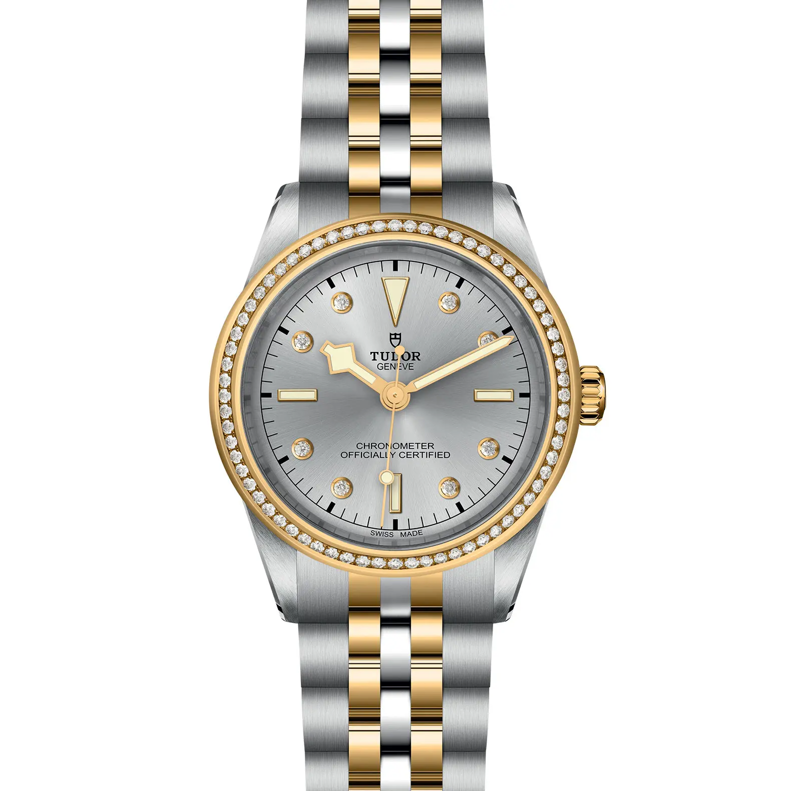 Prime maglie centrali in acciaio o in oro giallo massiccio. Le altre maglie centrali sono costituite da un’anima in acciaio rivestita da 0,2 mm di oro giallo. Chiusura pieghevole TUDOR “T?fit” con fermaglio di sicurezza. Il logo sul fermaglio è realizzato.